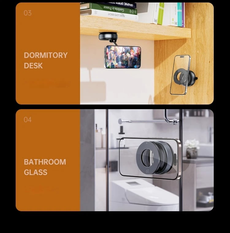 Multi-Scene Adaptability: Beyond serving as an excellent magnetic car phone holder, this vacuum phone holder also performs exceptionally well on smooth walls and mirrors. Whether you are cooking or bathing, it provides unparalleled convenience and support, freeing your hands and enhancing your daily life experience.